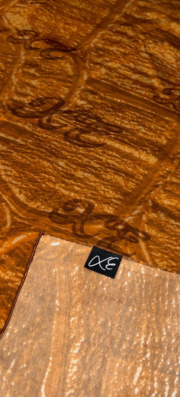 100% silk scarf with custom digital print design. Available in silver & bronze.